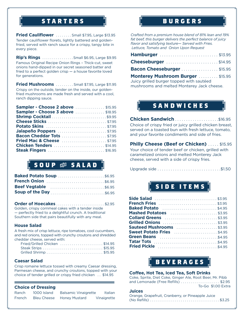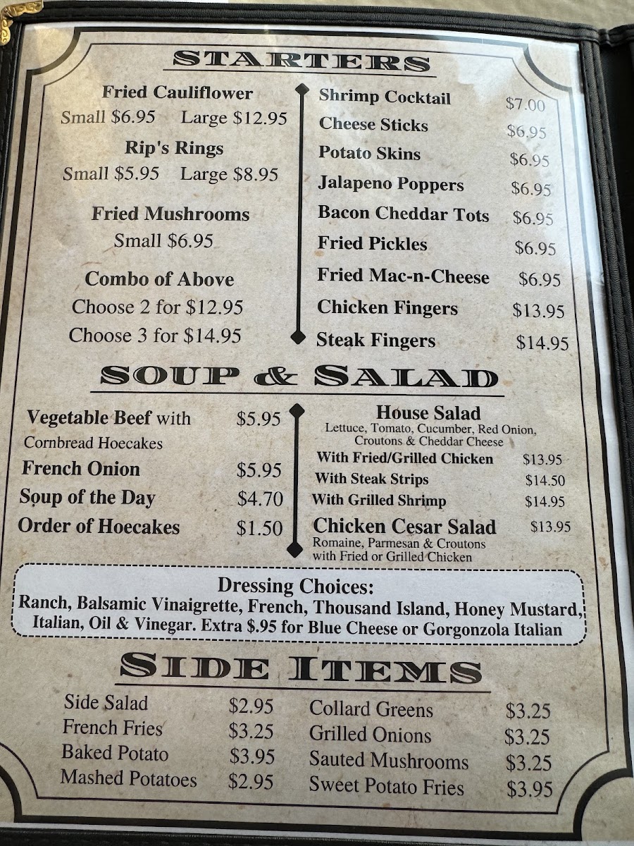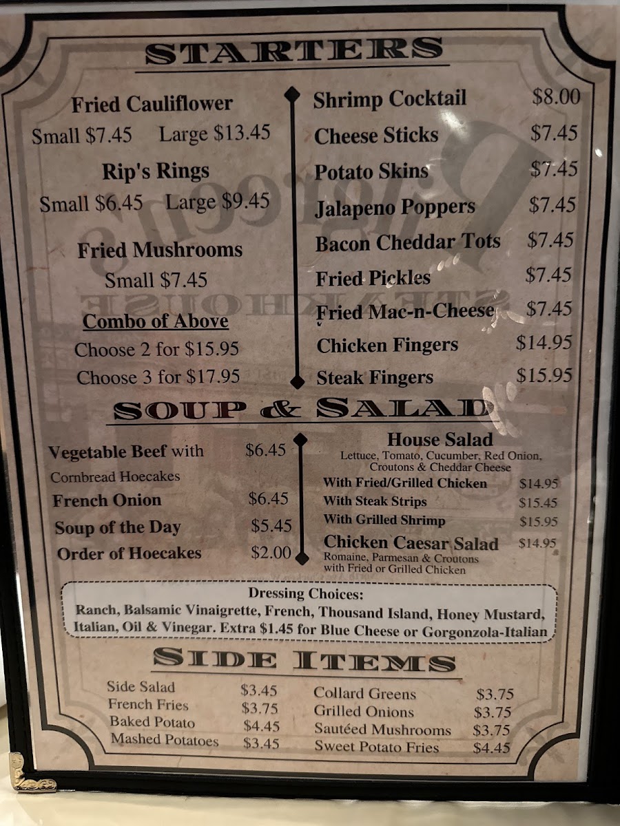 The menu features a range of well-crafted plates, from juicy ribeye and T-bone steaks to lighter options like Monterey Chicken or fresh salads. Sides such as baked potatoes, fried mushrooms, and classic fried onion rings complement the main courses perfectly, while the bar offers a selection of refreshing soft drinks and hot beverages to suit any occasion.